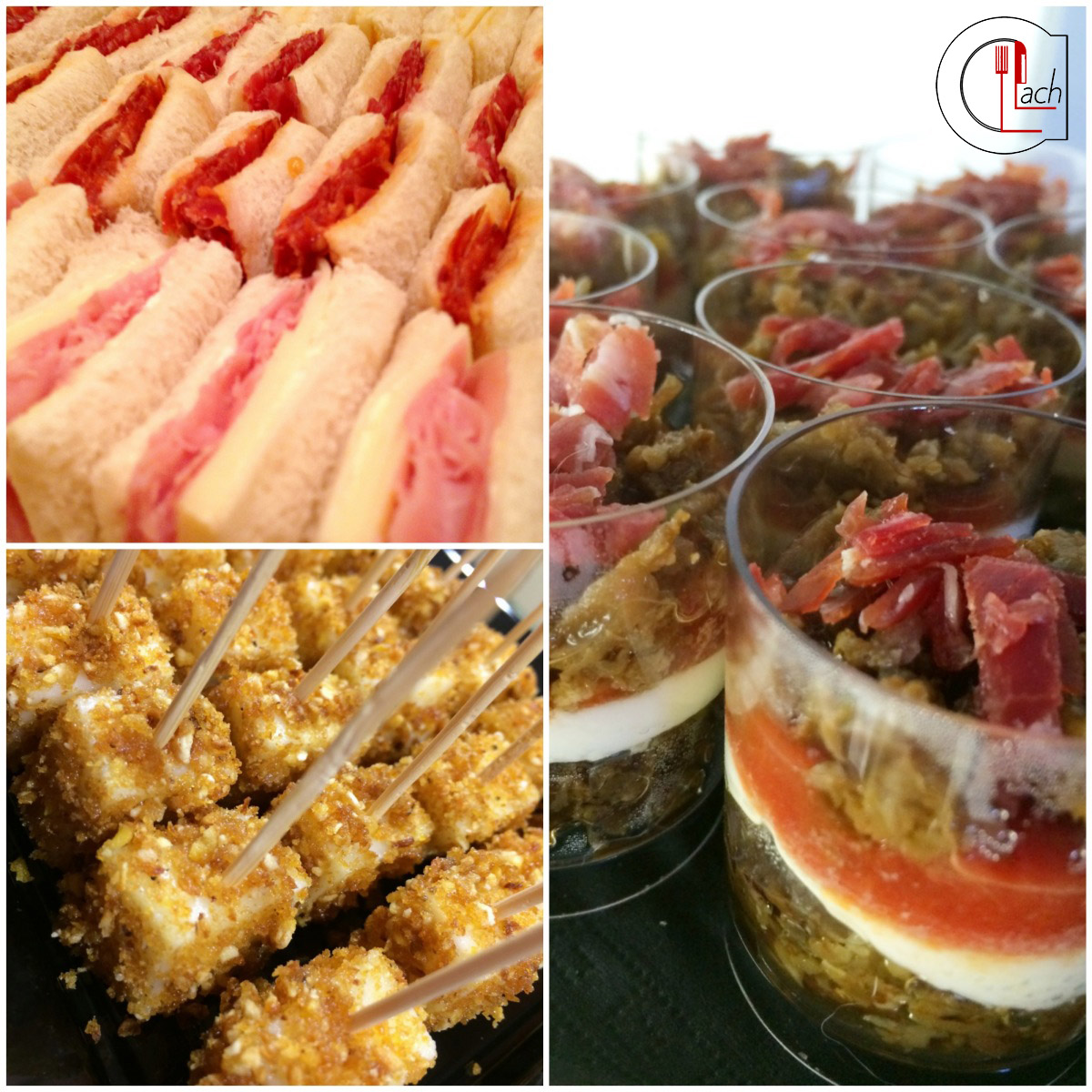 Productos del catering como los mini sandwiches, los pinchos de queso tierno rebozado con kikos! o una de sus delicatessen, vasitos de berenjena con mozzarella fresca, tomate y un toque de jamón ibérico.