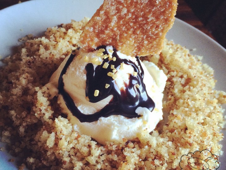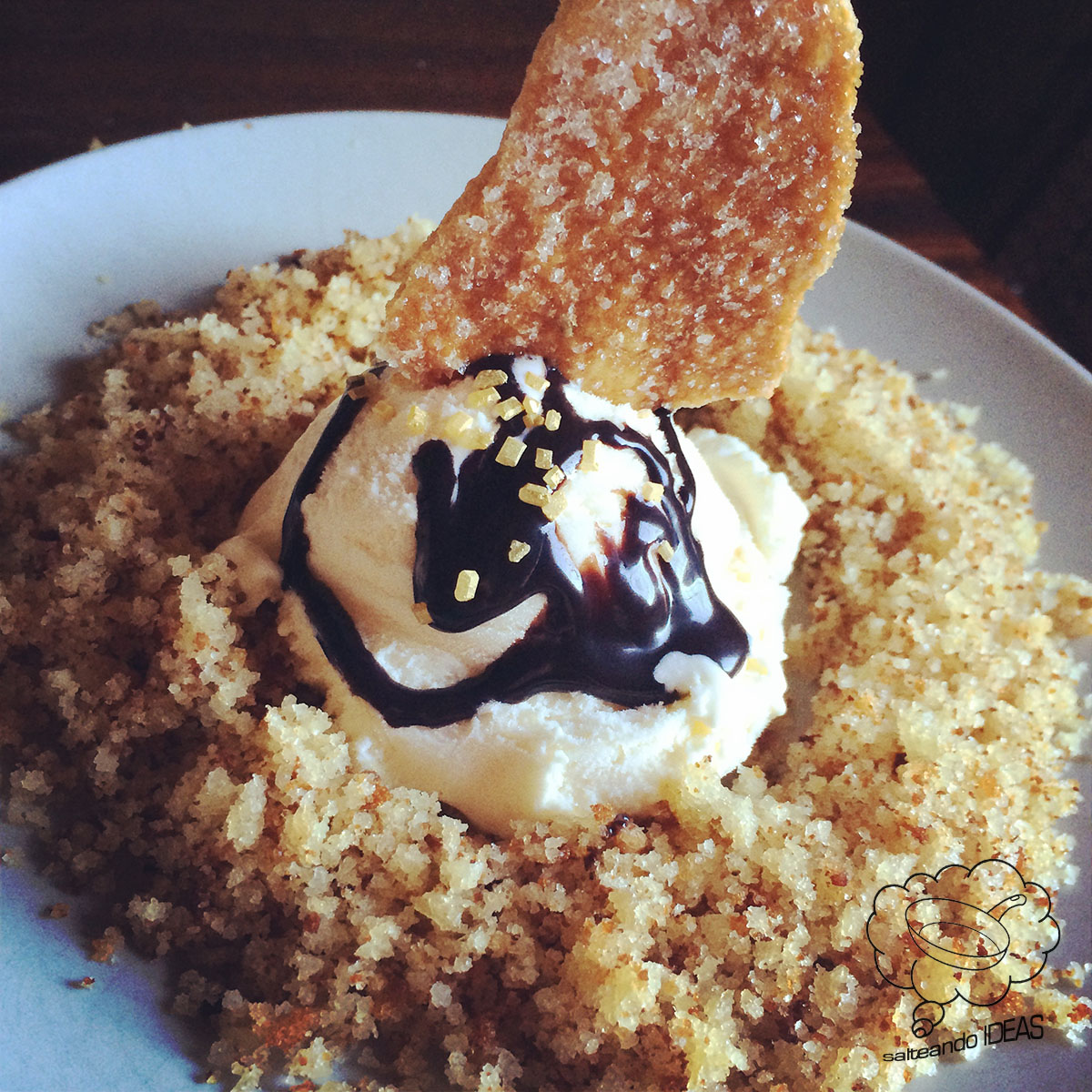 Hacemos un circulo con un agujero en medio con el buñuelo de semana santa triturado, en medio ponemos el helado de vainilla. Añadimos un toque de chocolate derretido por encima del helado y lo coronamos con una crujiente y dulce coca de vidrio también casera.