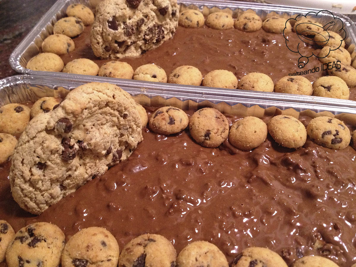 Una vez fundido el chocolate mezclamos con las cookies y lo hechamos en el molde que queramos, adornamos con unas cookies pequeñas alrededor y una grande enmedio sumergida.