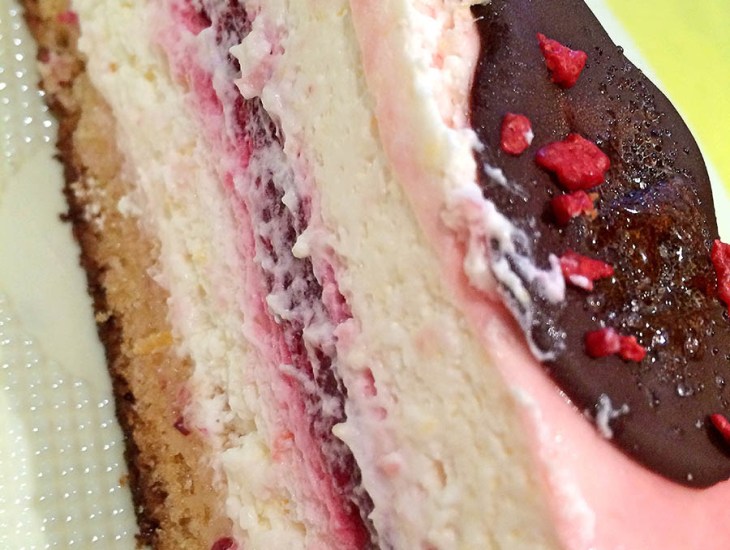 El corazón de gelatina de frutos rojos estaba muy bueno con un toque de acidez que le aportaba el zumo de limón y la textura perfecta, derritiéndose cuando te lo ponías en la boca. La base de bizcocho (que no es más que coca de yogur) absorbió toda la cremosidad del mousse de limón y estaba esponjoso y suave. En la capa de encima de la gelatina he cambiado el limón por naranja así que quedó un mousse de limón, una capa de frutos rojos, una mousse de naranja y una fina capa de gelatina de fresa.