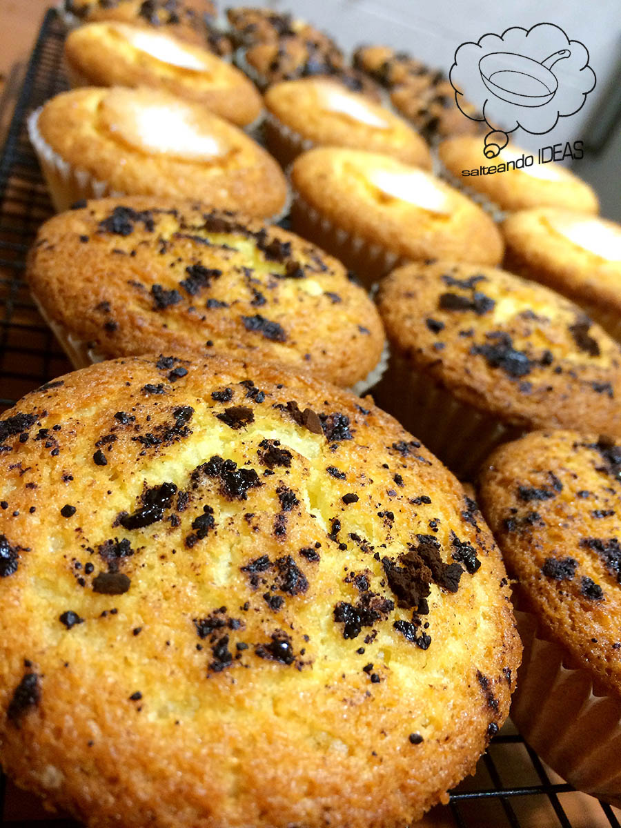 Disponemos la masa en moldes de magdalenas, llenándolos solo unas 3/4 partes. El horno lo tendremos caliente a unos 210º y el tiempo de cocción seran unos 15 minutos.
