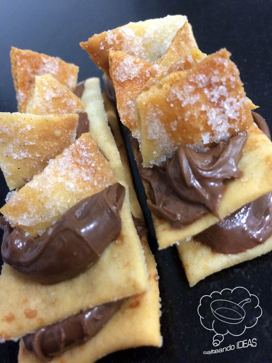 Yo he hecho unas bases de pizza de unos 100 g cada una y las he estirado a lo largo. El chocolate que he usado es mi querida Nocilla pero podéis poner la que queráis, y encima trocitos de coca de vidrio. Vamos a ello!
