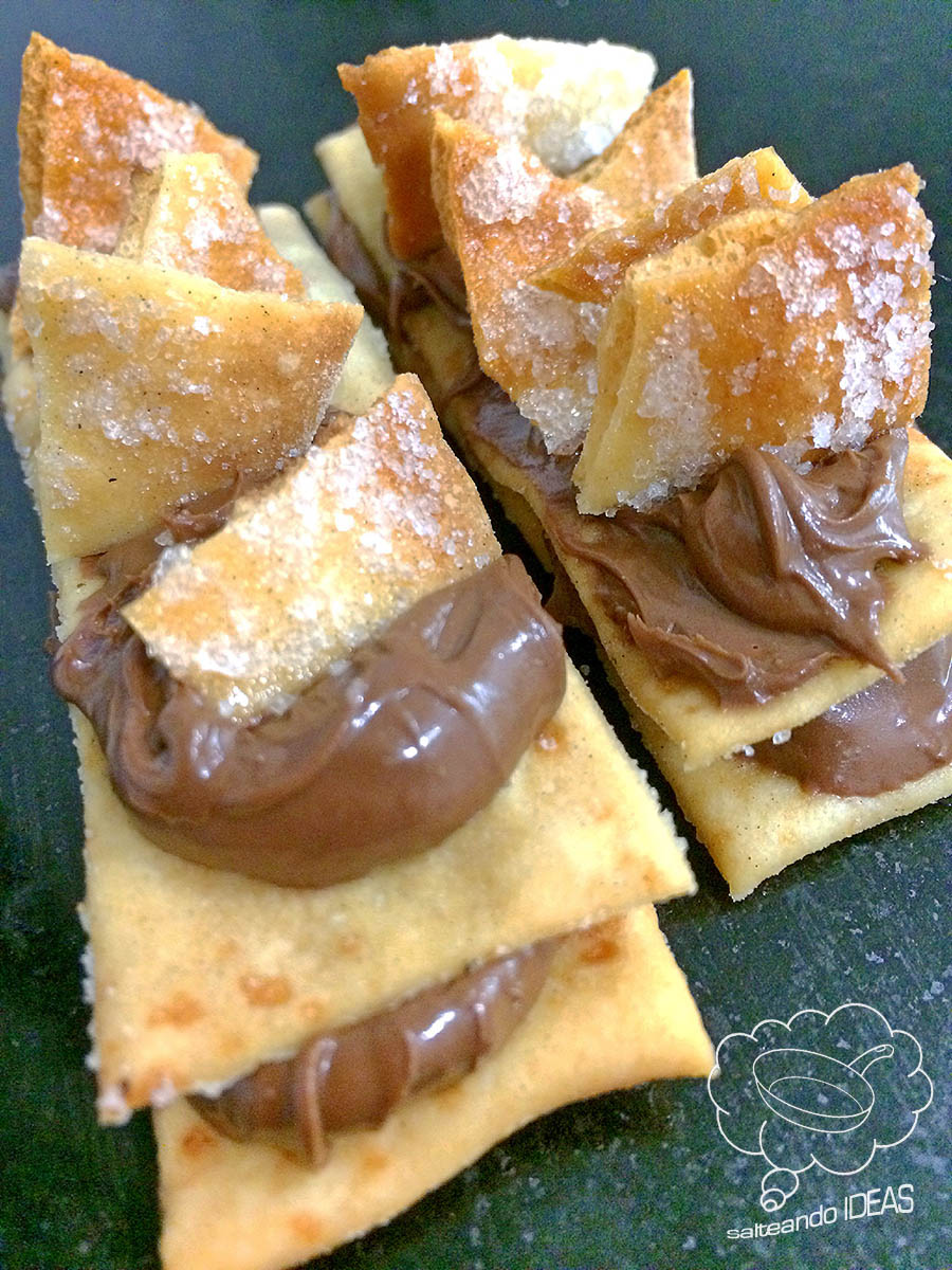 Montamos los crujientes! Untamos una porción con un poco de Nocilla, seguidamente otra porción encima y más chocolate, finalmente troceamos trocitos de la coca de vidrio y los clavamos en la última capa de Nocilla. Ya los tenemos! son impresionantemente buenos!