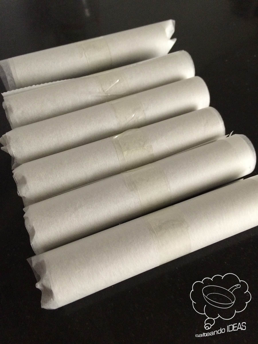Mientras tanto cogemos los tubos de acero y los forramos con papel vegetal (ayudándonos de un poco de celo por el medio). Intentad que al cortar la tira sobre un poco de papel por un lado porque así será más fácil de sacar.