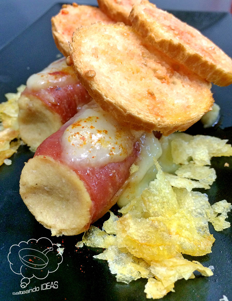 Una vez echo ahora los forramos con dos lonchas de jamón. Intentad que de un lado la loncha esté cortada recta así quedan más bonitos. Forrad la mitad de un tubo con una loncha y la otra mitad con la que os queda, apretad un poco al terminar. Seguimos con los demás hasta tener los seis terminados.