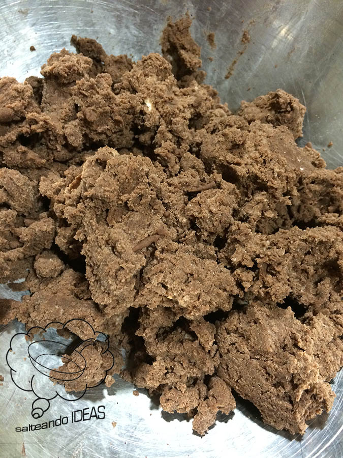 En un bol tamizamos la harina, el cacao en polvo y el café, una vez tamizados añadimos el azúcar. Seguidamente añadimos la mantequilla y vamos ligando con las manos. Os parecerá que no puede atarse pero al cabo de unos 2-3 minutos veréis como os queda una masa como en la de la foto, tiene que quedar como arena granulada.