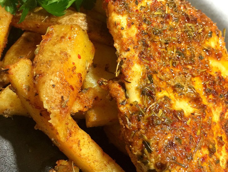 En una bandeja de horno ponemos un poco de aceite en el fondo y añadimos las patatas salándolas un poco y echando un poco de la mezcla cajún sobre ellas. En un plato vertemos la mezcla que nos queda e impregnamos bien las especias sobre las dos pechugas de pollo, bien rebozado con ellas.