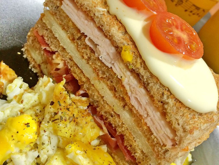 Restregamos tomate con las rebanadas de pan (aquí se nota la costumbre catalana pero también es una muy buena manera de no poner mantequilla en los sandwiches). La disposición de los ingredientes es como queráis vosotros, yo he puesto: pavo, queso curado, jamón serrano y queso tierno.