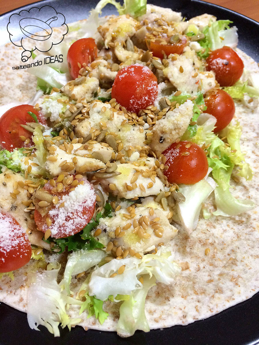 Hoy mi comida era una ensalada con pollo y tomates cherry pero en vez de cortarme alguna rebanada de pan para acompañarla he pensado en hacerme un wrap.
