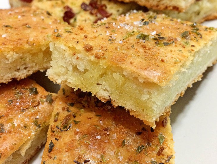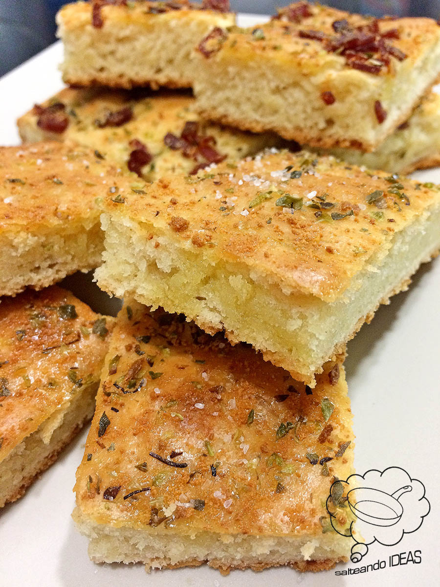 La focaccia es similar a la pizza, es muy popular en Italia y generalmente se aliña con aceite de oliva y sal gruesa, aromatizándola con hierbas como el romero.