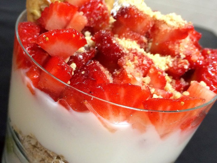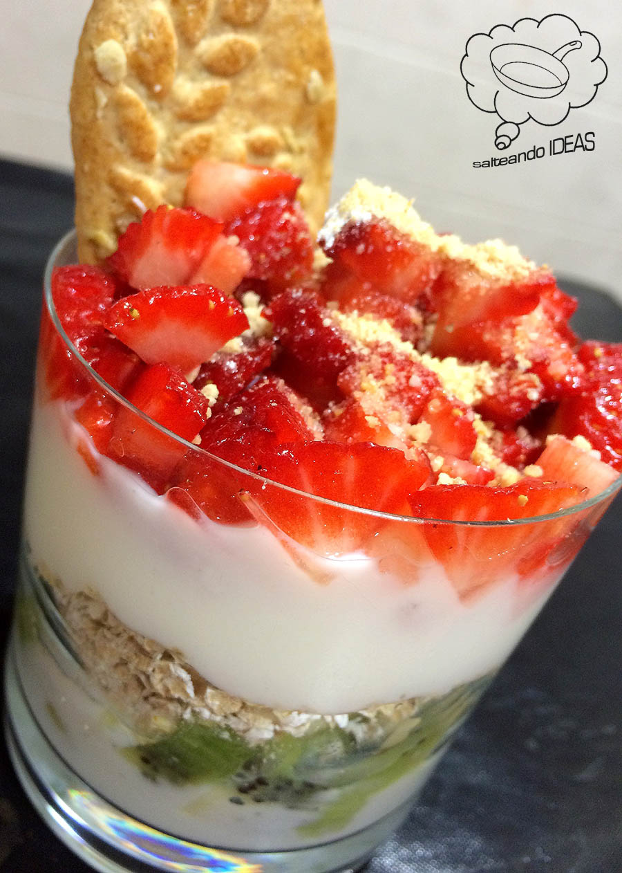 Yogur, el kiwi, un poco de avena, yogur, las fresas y como toque final, triturar un trozo de galleta y espolvorearla por encima, la otra nos ayuda a embellecer más el vaso.