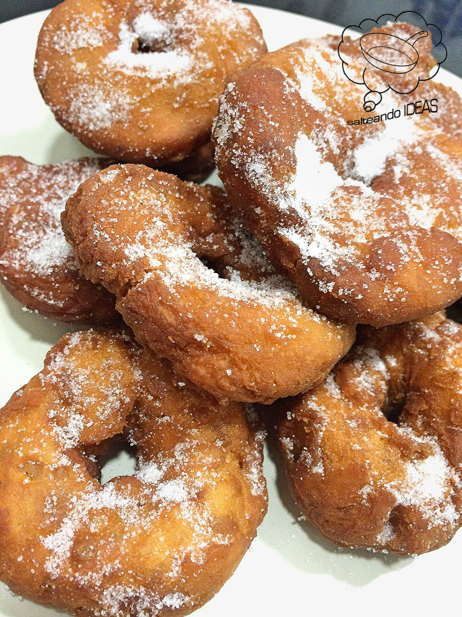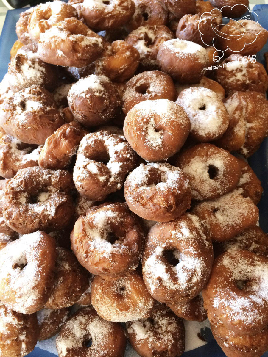 Ya solo os queda ensuciados las manos de harina, ir haciendo pequeñas bolitas (no amaseis la masa, solo lo justo para hacer la bolita) con un agujero en medio y a freír en una cazuela con bastante aceite. El aceite tiene que estar muy caliente, desde el momento que los echáis dentro son unos 2-3 minutos por cada lado. Cuanto más grandes los hagáis más os costará que se cuezan.