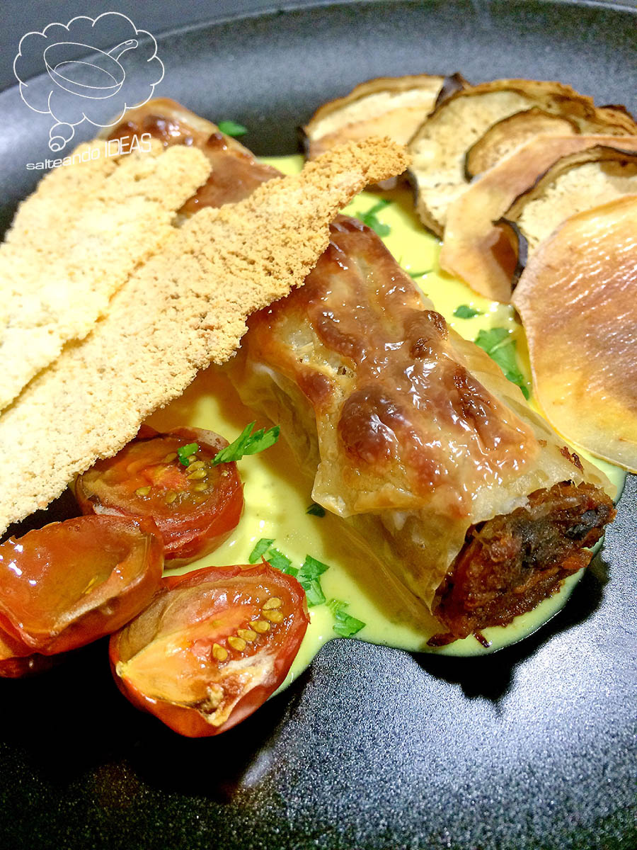 Empezaré diciendo que el canelón y todo lo que le rodea son texturas crujientes. El canelón es de verduras y recubierto con pasta filo. Encima de el va un poco de queso gratinado y pedazos de parmesano crujiente. Debajo encontramos una bechamel muy especial, de curry con un toque de miel y finalmente encontramos las chips de verduras con unos cherrys horneados.