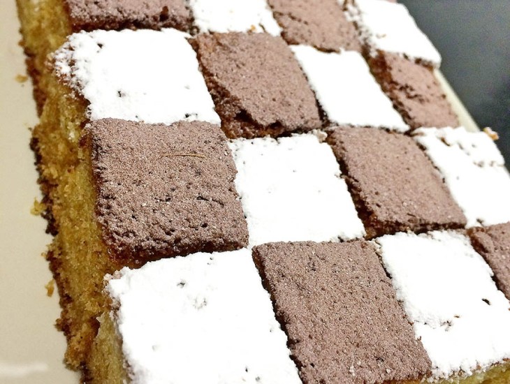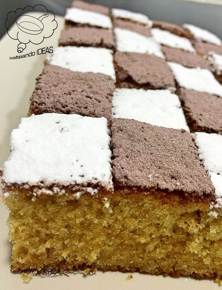 Ayer pensaba en las ganas que tenía de comer un trozo de mi bizcocho de yogur con sabor a buñuelo, hoy, lo he preparado con muchas ganas de poder hincarle el diente pero mientras lo hacía pensaba en presentarlo de una manera divertida, así que se me ha ocurrido… en modo ajedrez, ¿llama la atención verdad? Es una manera muy bonita de presentar el bizcocho para una merienda con amigos, para después de comer con el café… Solo necesitáis chocolate en polvo y azúcar glas
