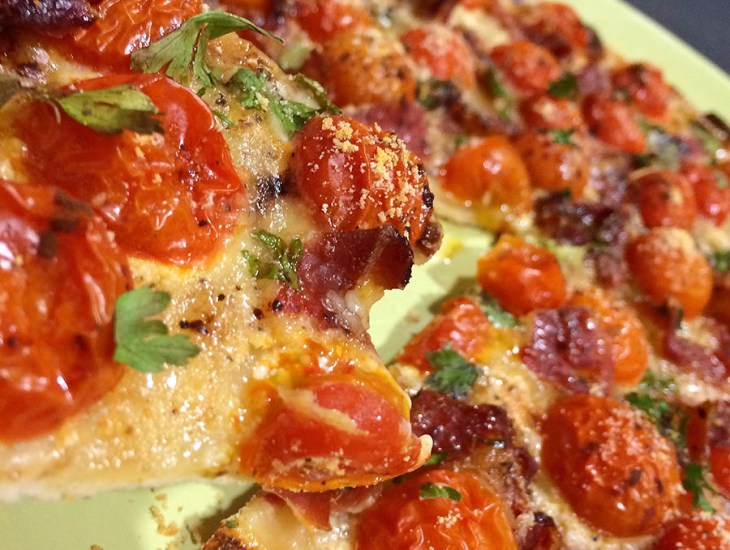 Esta pizza está hecha con masa quebrada y hay una gran mezcla de sabores dulces y salados, es realmente una delicia, os lo puedo asegurar.