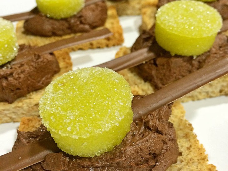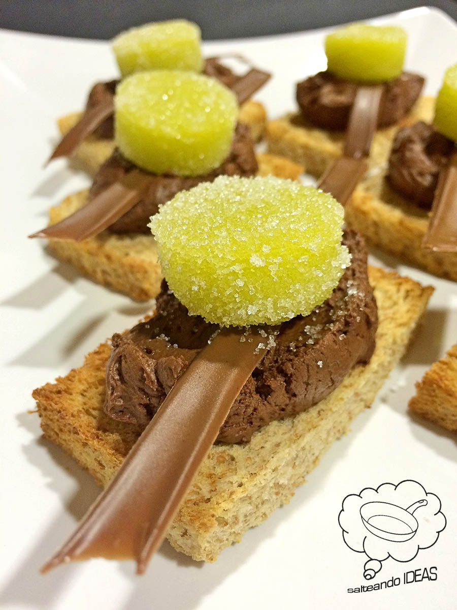 Ponemos un poco de la ganaché montada en cada rebanada, una decoración con chocolate con leche encima (lo que más os guste), una golosina de gelatina dulce de aceite y… A COMER!!!!