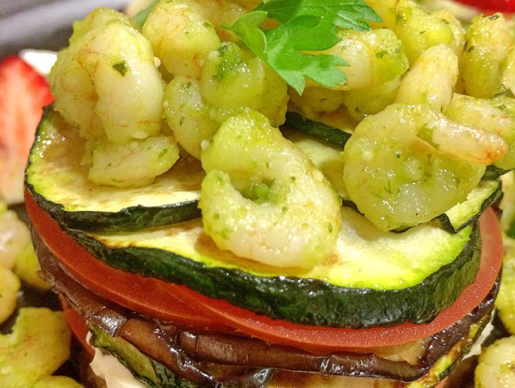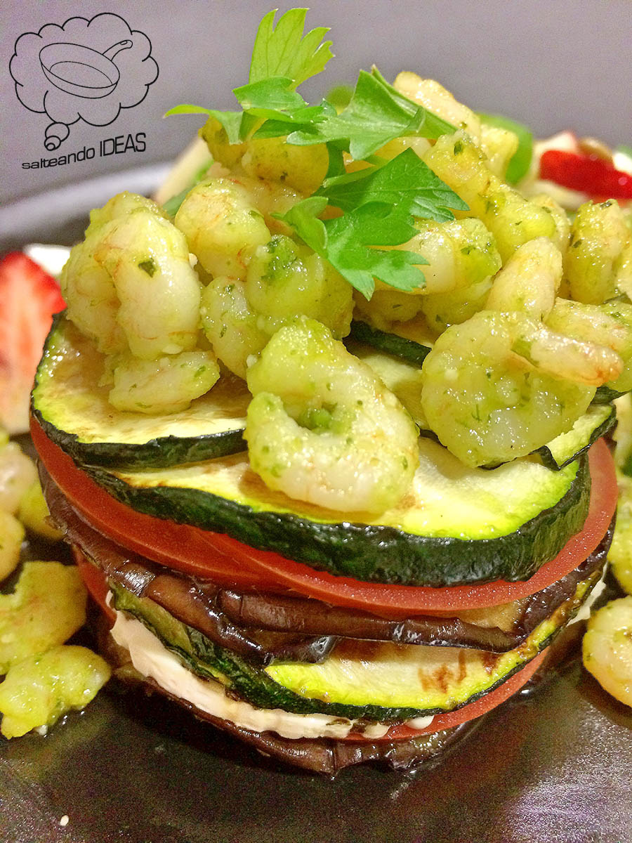 Berenjena, tomate, queso fresco con un poco de albahaca, calabacín, berenjena, tomate y calabacín.