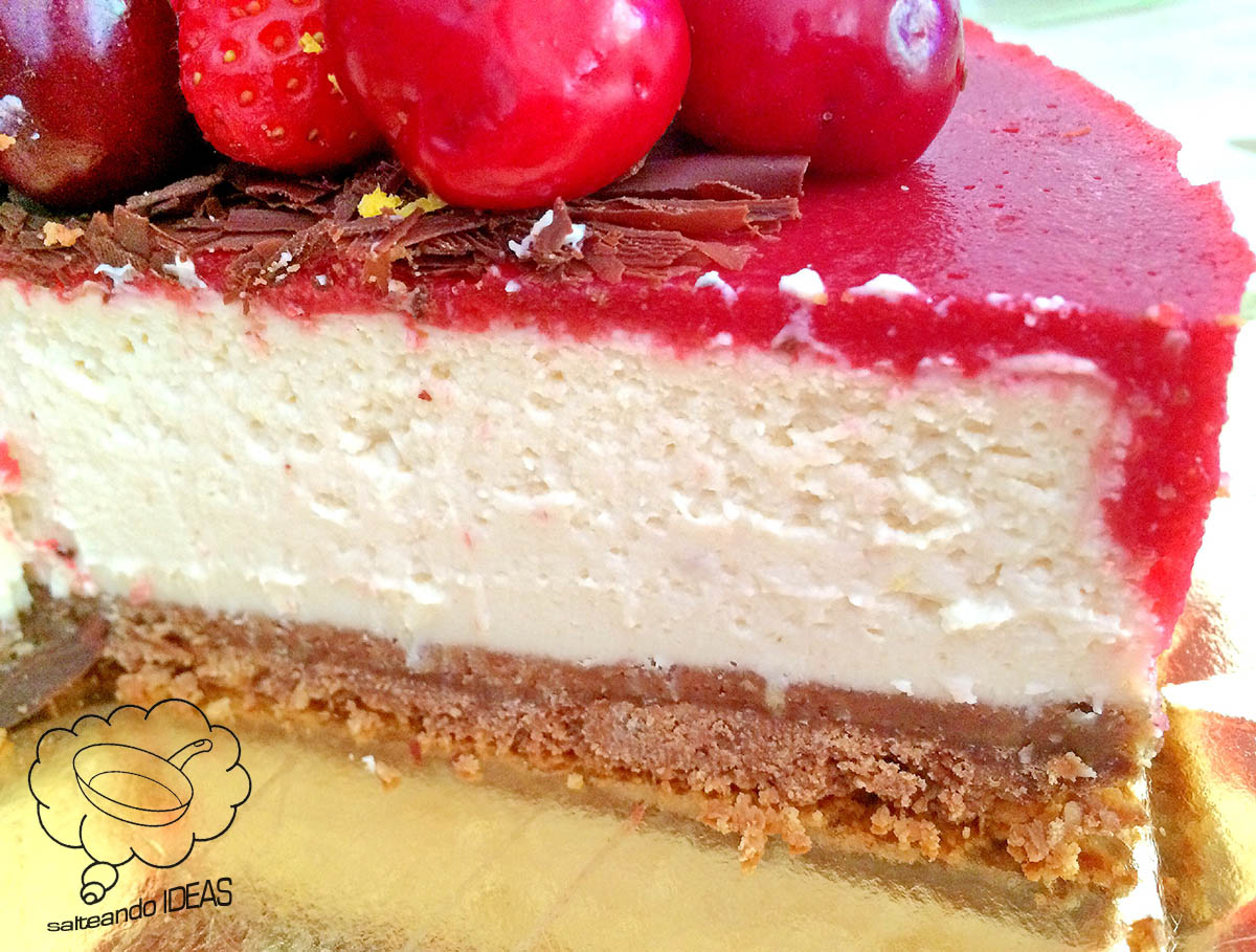 cheesecake_limon5 18 mayo, 2015 Cheesecake de limón, con base de chocolate y gelatina de fresas y cerezas. 1200 × 909