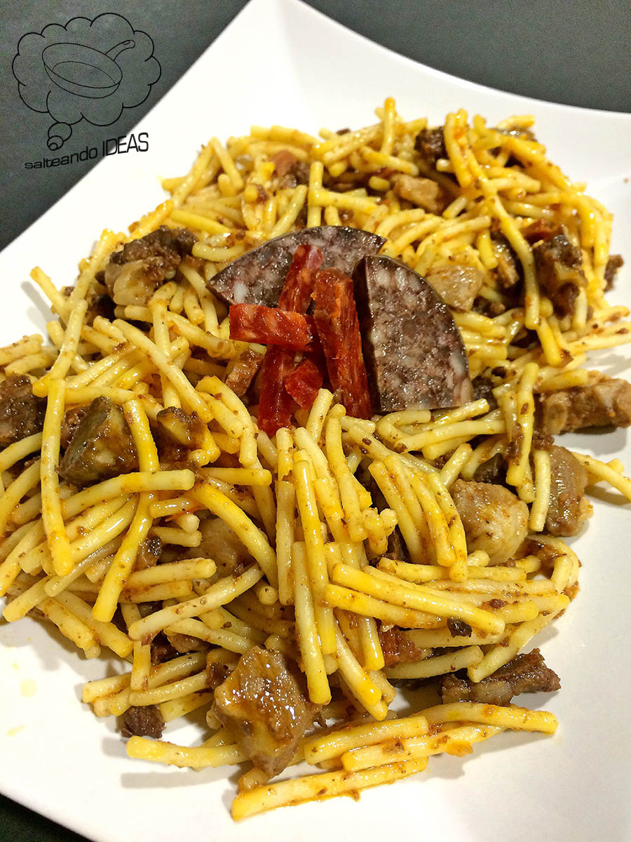 Cuando eramos pequeñas mi madre nos hacia un plato heredado de la suya, ella lo llamaba «Fideos a la cazuela». Primero hacia un sofrito, luego añadia la carne y cuando ésta estaba dorada, echaba los fideos junto con caldo para que se fueran haciendo como si de un arroz se tratase.