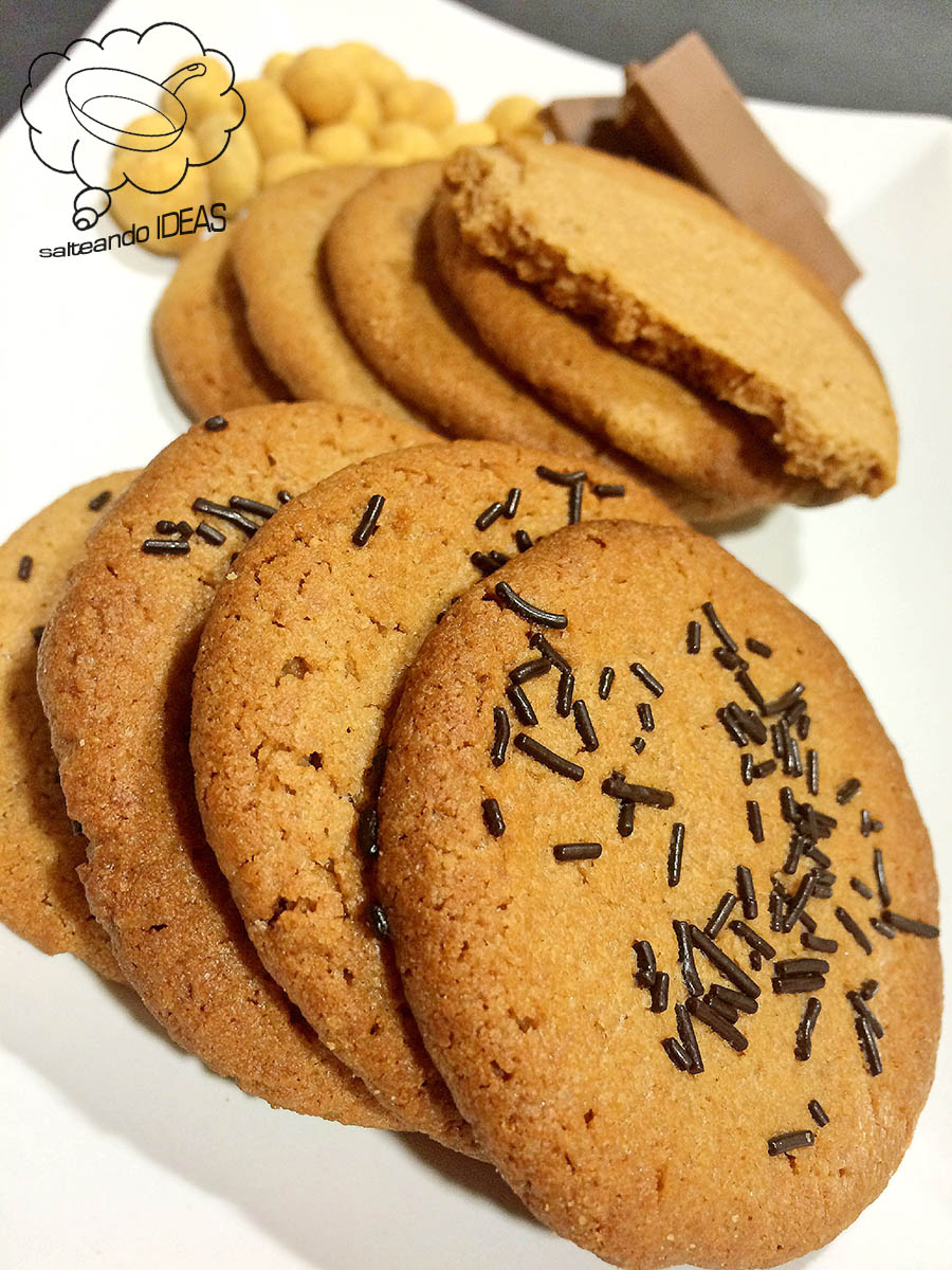 Desde hace días, tengo un pote de crema de cacahuete en casa pensando que algo debería hacer con el ya que en las películas y series que proceden de EEUU hablan tanto de esta crema y la usan para muchos sandwiches etc… Aquí no estamos nada acostumbrados a ella y personalmente la encuentro muy fuerte de sabor, pero con las galletas me ha gustado!
