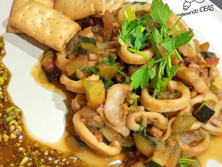 Hoy me iba a hacer calamares a la plancha pero al ver un calabacín en la nevera… Me lo he pensado mejor y me he puesto ha hacer un salteado de verduras con un toque de salsa de soja. Lo he querido acompañar con una suave vinagreta con pistachos, pero esta parte es opcional ya que los calamares por si solos ya tienen mucho sabor.