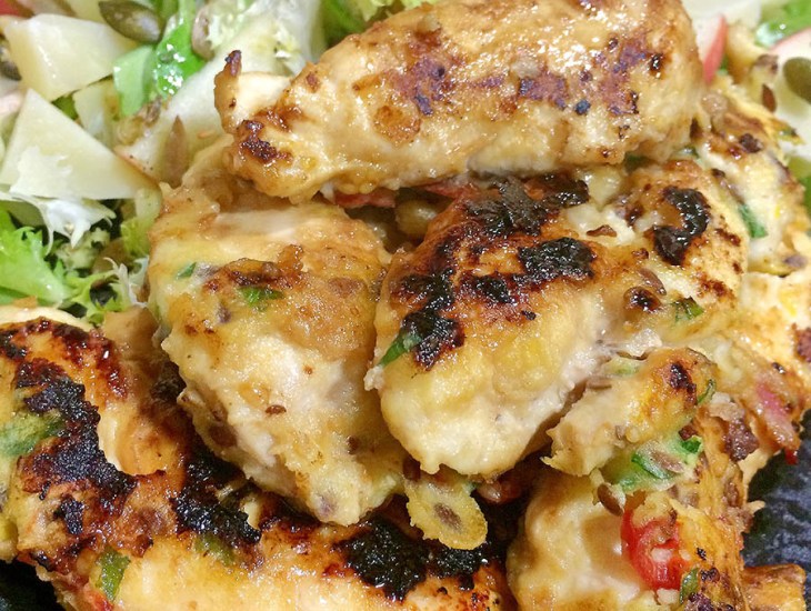 Cuando el pollo está ligeramente dorado, le añadimos (con una cuchara) un poco de la salsa que ya tendremos preparada, luego le damos la vuelta y volvemos a añadir la salsa por el otro lado.
