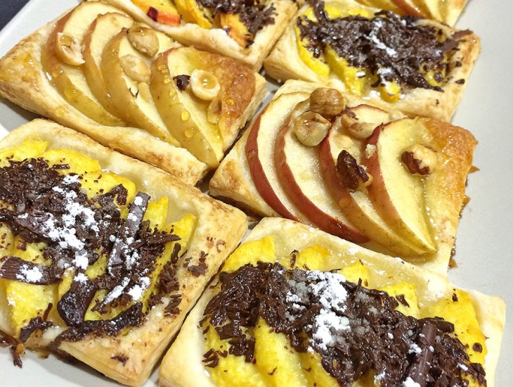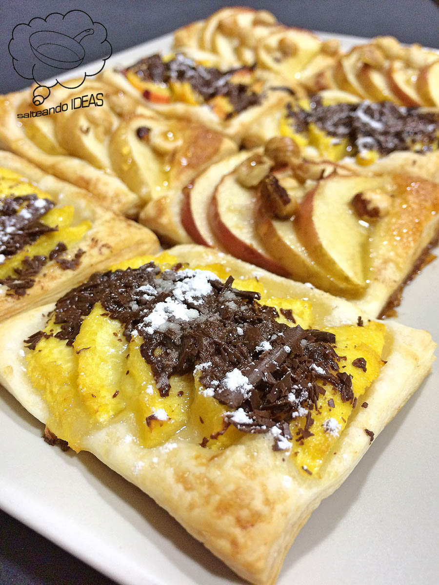 Ahora cortamos la manzana y el melocotón y lo vamos disponiendo encima del hojaldre.