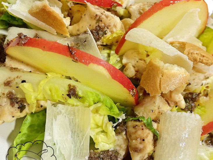 Así que hoy he querido hacer esta ensalada parecida a la típica césar, pero añadiendo la manzana y en vez de la salsa césar, poner la esencia principal, el queso parmesano pero con una vinagreta fácil y sin nada de huevo o mayonesa.
