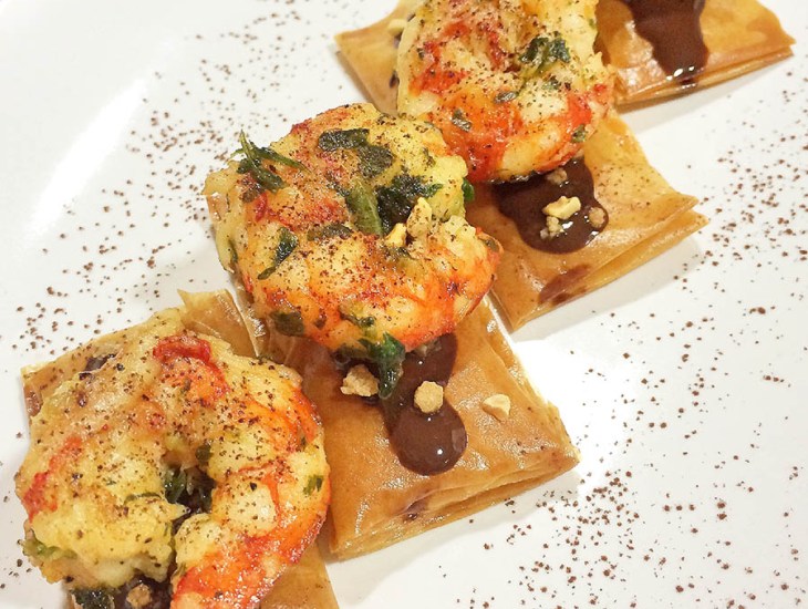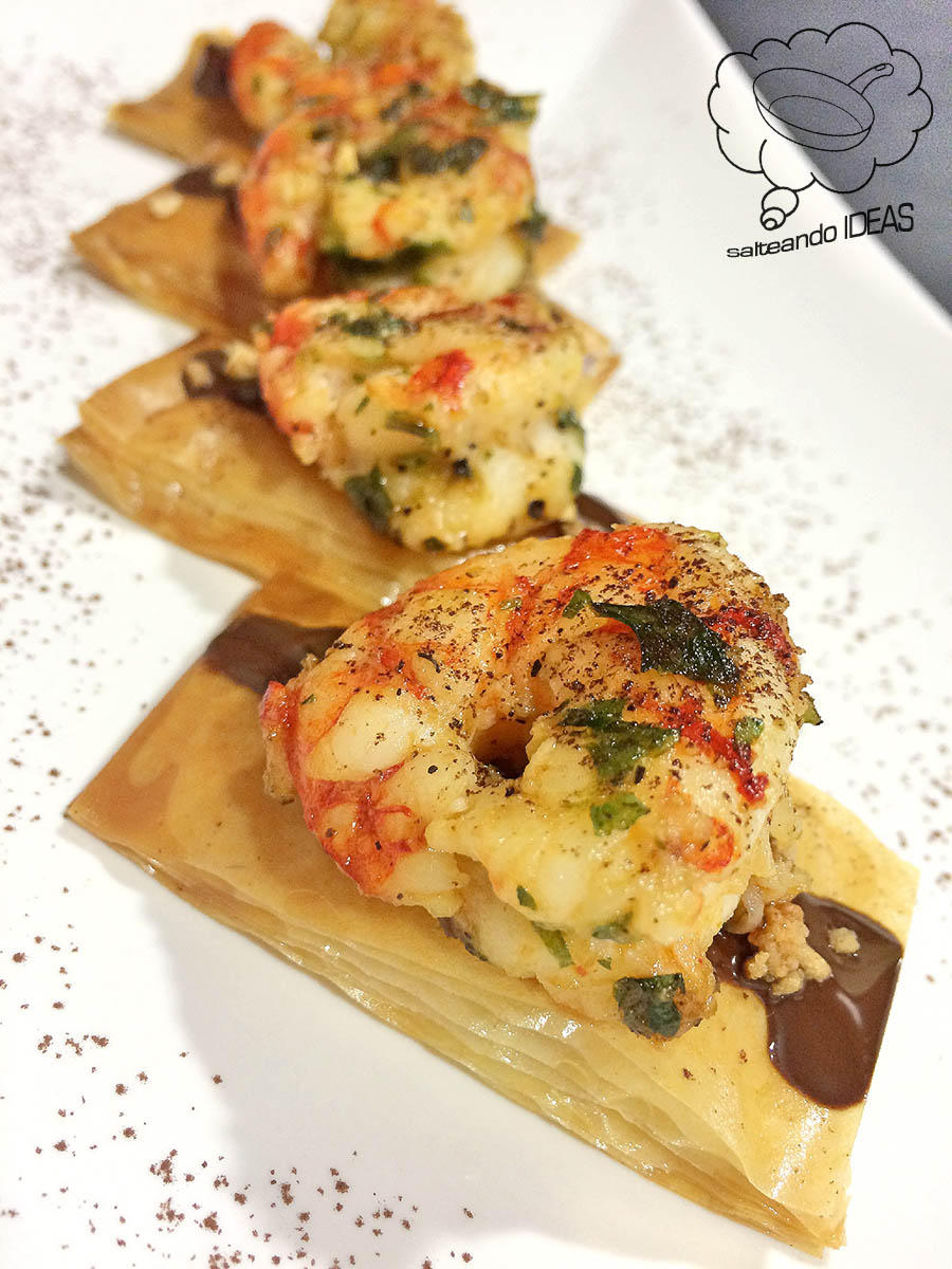 En esta tapa se juega con el aspecto pero también con una combinación que no estamos muy acostumbrados a ver, langostinos con chocolate.