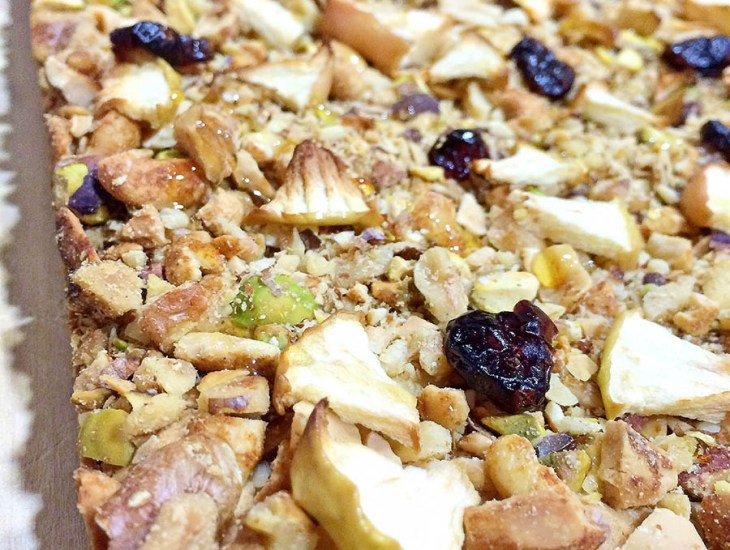Es muy fácil de hacer y los ingredientes principales son la harina y el azúcar, depende de las regiones o ciudades se puede encontrar variada, con fruta, con pasas, con un toque de sabor a vainilla… Yo he hecho una pequeña variación a la base original y he añadido maznana, unos pocos arándanos deshidratados y un toque de miel por encima.