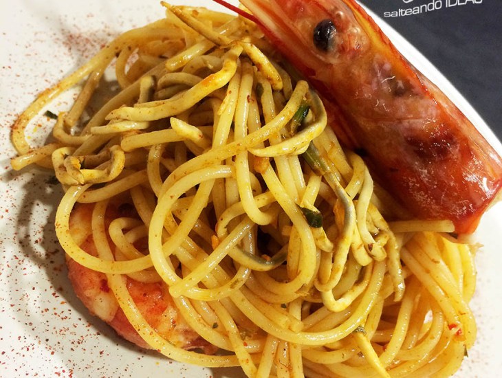 He añadido mis toques personales, en los espaguetis con gulas hay el jugo de las gulas, ñoras, ajo y perejil, estan increíbles! Y para dar el toque picante, aparte he cocinado la gamba lagostinera con un poco de tomate y chile, todo junto… Delicioso!!!!