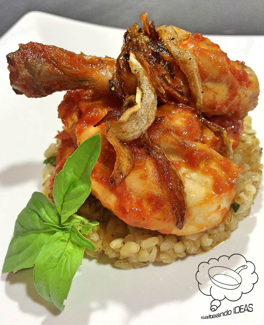 Para montar el plato, nos hacemos con un aro de acero, lo rellenamos con una capa fina de arroz (lo apretamos un poco). Sin quitar el aro, ponemos encima el conejo.