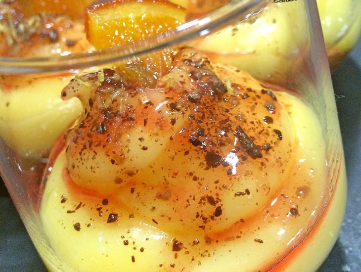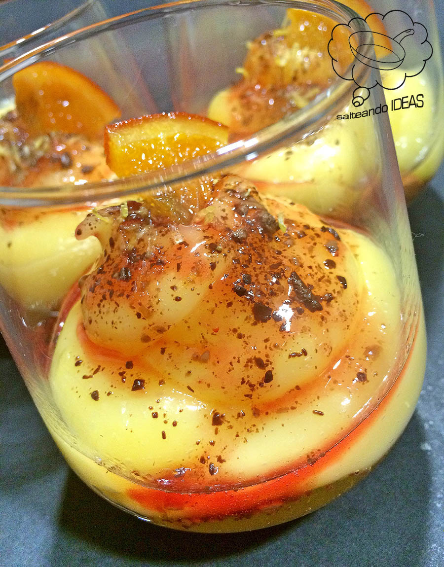 Para montar los vasitos, ponemos una cucharada de mermelada de naranja amarga en el fondo y un poco de chocolate troceado. Con una manga pastelera nos ayudamos para añadir la crema a los vasos.