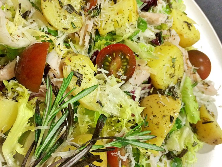 En el fondo del plato ponemos un poco de ensalada, las lonchas de pavo cortadas, los gajos de patata y los tomates cherry. Aliñaremos generosamente la ensalada, un poco más de pimienta por encima y finalmente el queso seco rallado, este le dará un toque aun con más cuerpo.
