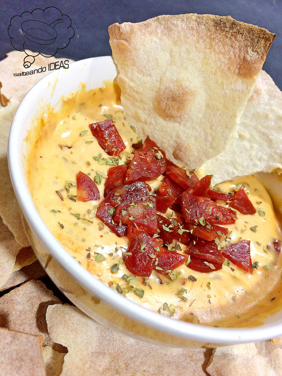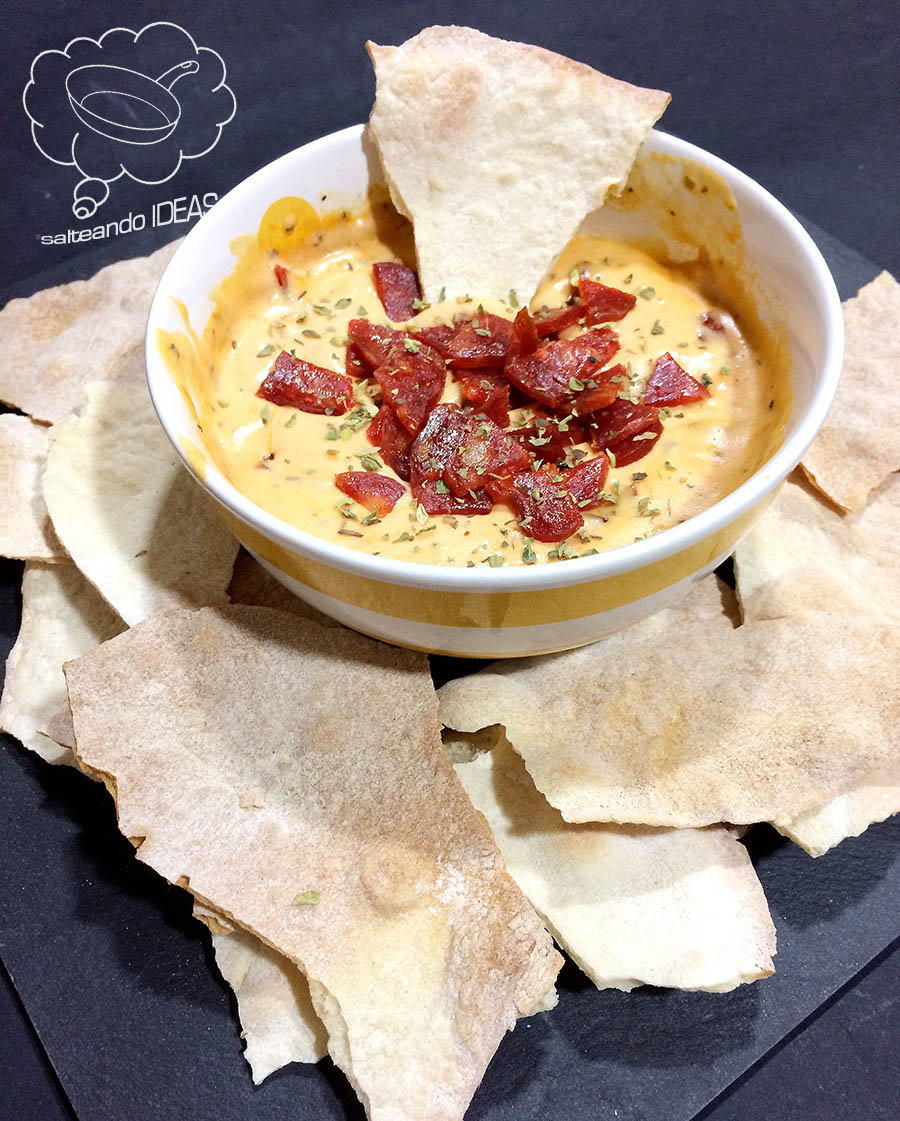 Dips de pan de pizza con salsa de queso y chorizo (no se endurece)