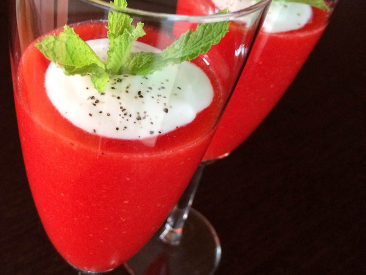 Pasado el tiempo de refrigeración, vertemos el gazpacho de fresas en dos copas altas de cava o triangulares de cóctel. Con una cuchara pequeña, ponemos dos cucharadas de nata justo en el centro, un poquito de pimienta por encima y una hoja de menta para adornar.