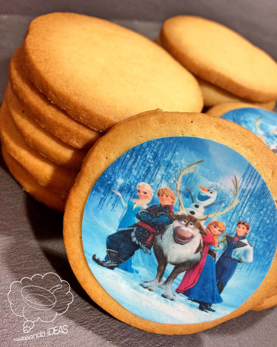 Normalmente las galletas adornadas se acaban decorando con pasta de azúcar, glasé real o fondant para dar un aspecto más bonito y bien terminado pero en casa no somos mucho de estos sabores, lo único que he hecho ha sido hacer unas buenas galletas de mantequilla, tener un poco de cola alimenticia y poner encima los dibujos de Frozen.