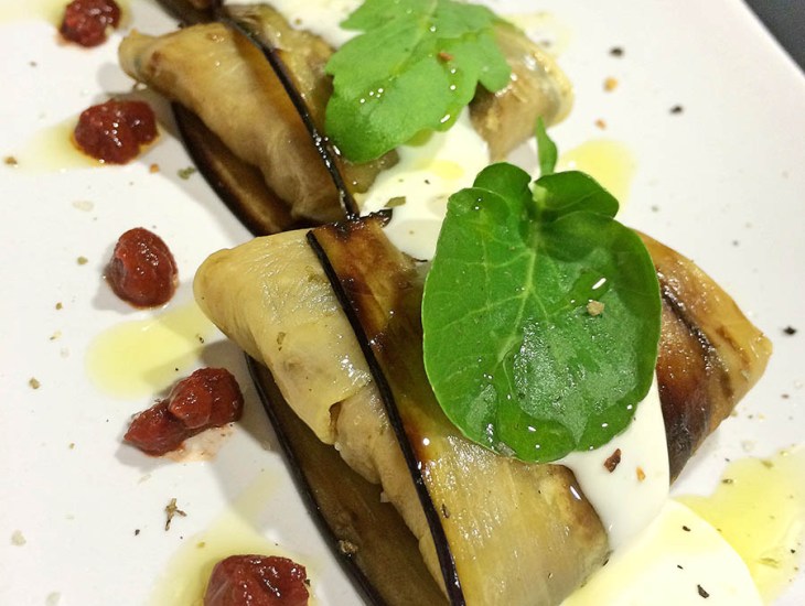 Para hacer los envoltorios ponemos dos berenjenas en forma de cruz, ponemos un poco de relleno en el centro y le damos forma cuadrada con las manos, vamos intercalando los extremos de las lonchas y lo giramos para emplatar.