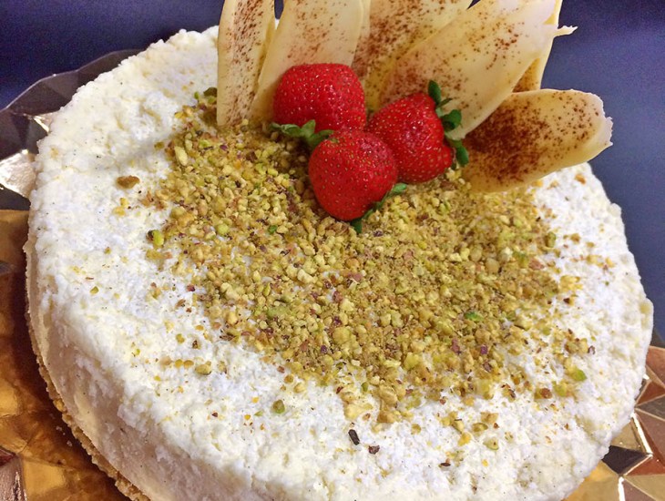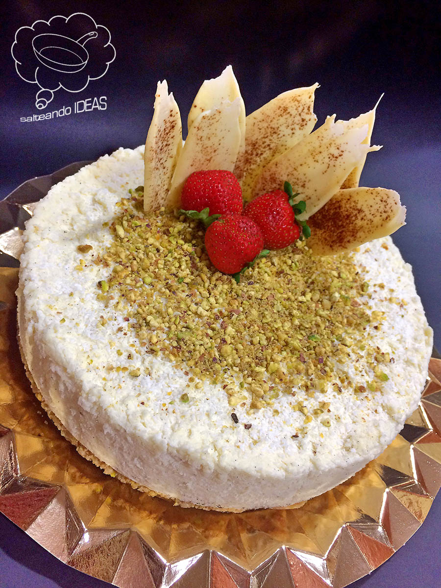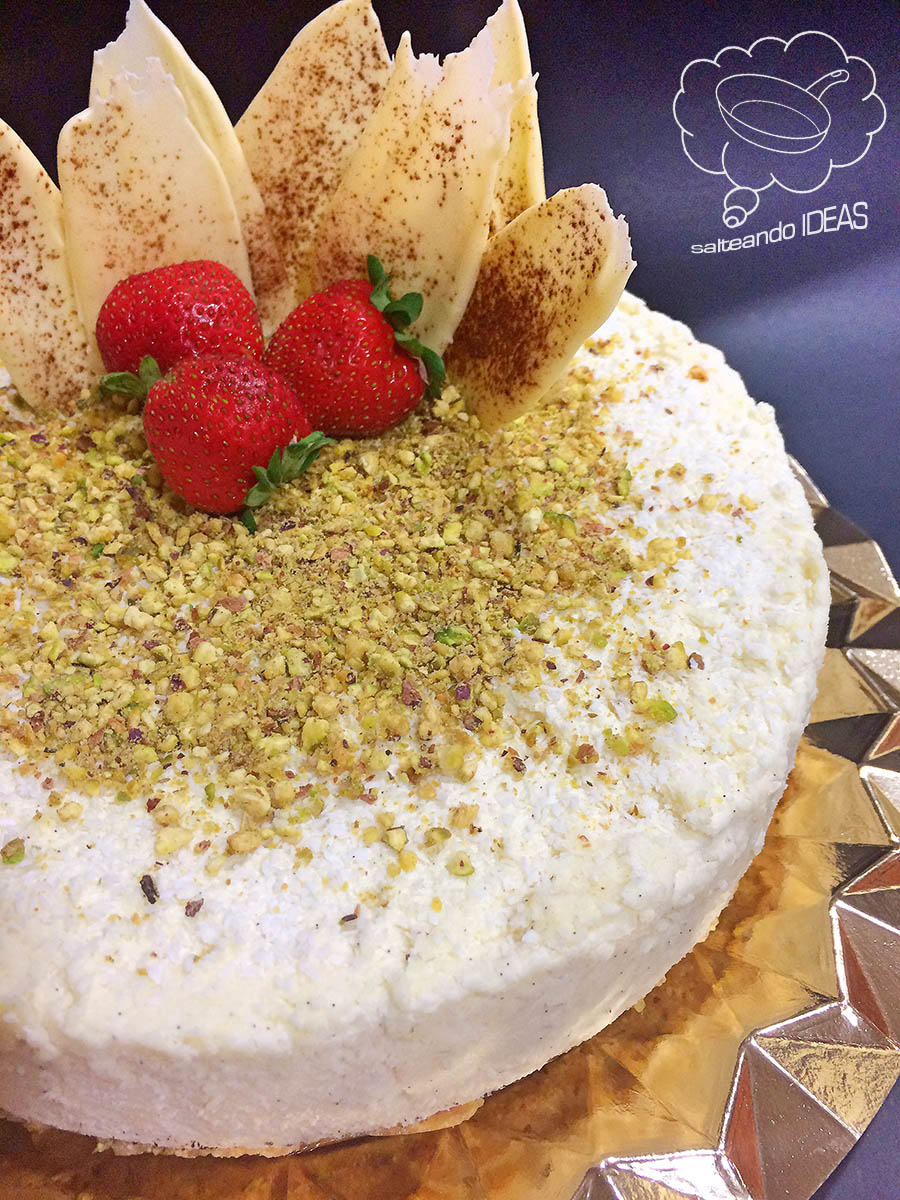 Una vez transcurrido este tiempo, desmoldaremos con la ayuda de un cuchillo y con cuidado. Encima esparciremos un poco de coco rallado, en el centro los pistachos triturados y ya solo nos falta el toque final, el chocolate para decorar y unas fresas.