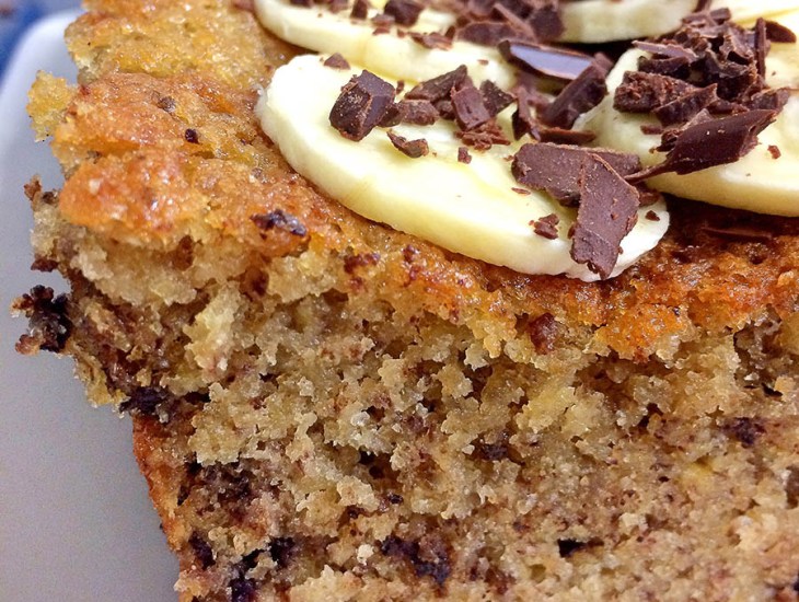 Una vez horneado y dejado enfriar, lo desmoldaremos tirando del papel vegetal, lo dispondremos en una bandeja y acabamos decorando con unas lonchas de plátano y un poco de chocolate troceado por encima.