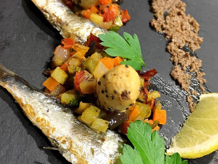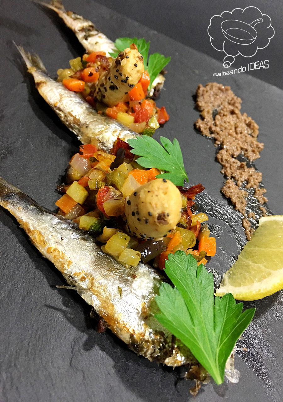 Una vez tenemos las sardinas cocidas y la verdura en su punto nos disponemos a montar este plato.