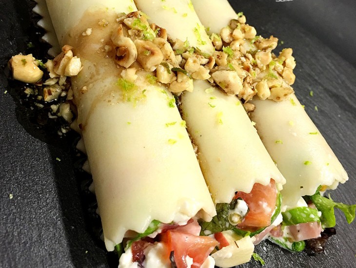 Encima del plato de canelones dispondremos un loco de esta vinagreta por encima y como toque final rallaremos al momento un poco de piel de lima por encima, es la guinda para este plato tan fresco y elegante.
