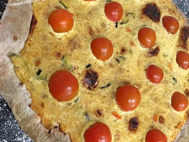 Encima pondremos unos tomates cherry partidos por la mitad y al horno durante 10-15 minutos, hasta que veais la masa de la pizza tostada y la preparación para quiche dorada.