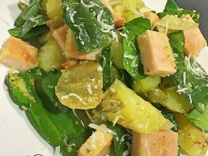 Soy una fan incondicional de la salsa al pesto y cualquier plato que lleve esta salsa no dudo en probarlo! Con la receta de hoy he querido hacer una ensalada completa, con proteina, espinacas y carbohidratos, el sabor se lo da la mezcla de salsa con aceite de oliva virgen y el toque crujiente las pipas de calabaza, también una fuente de vitaminas!