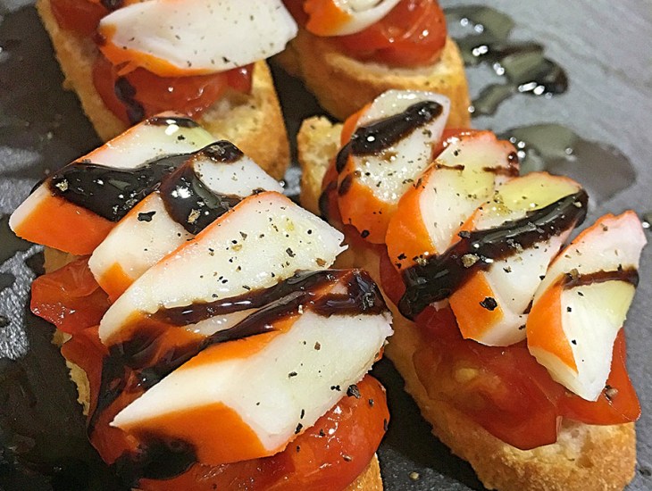Cuando las saquemos ya podremos poner encima un poco de tomates dulces, el cangrejo laminado y por encima un poco de aceite de olvia, reducción de Módena y pimienta.