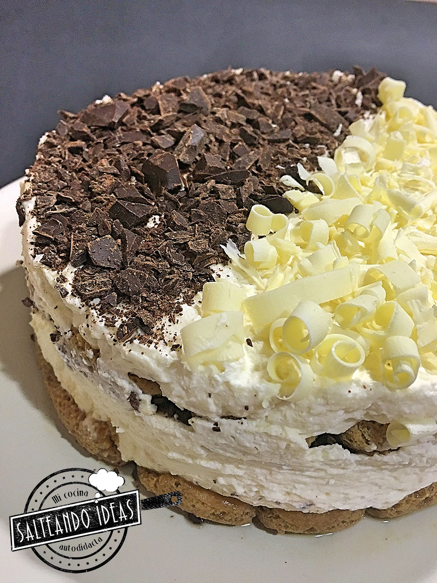 Tarta de tiramisú sin huevo y con chocolate blanco y negro