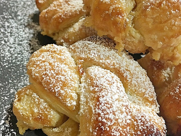 Se trata de unos nudos bañados con un almíbar de licor de anís y una suave capa de azúcar glass para decorarlos.