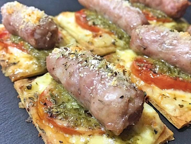 La sacamos y cortamos rectánculos más o menos del mismo tamaño todos. En cada uno de ellos ponemos un cuarto de la loncha de queso gouda, encima una rodaja de tomate, un poco de pesto, la media salchicha encima, un poco de parmesano rallado y solo nos falta el orégano como toque final.