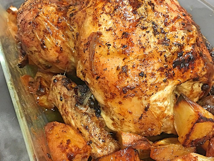 Trascurrido esos 45 minutos del pollo en el horno lo retiraremos y le añadiremos por los lados las patatas junto con las cebollas, las salpimentaremos.