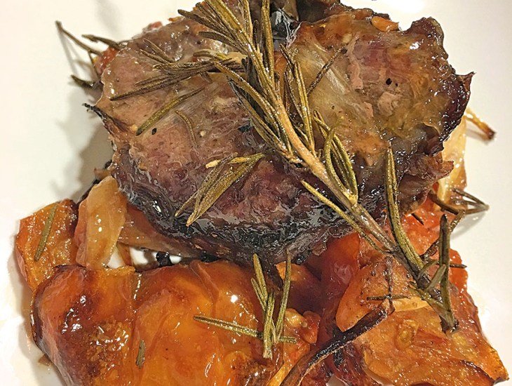 Ahora salpimentamos las galtas de cerdo y las disponemos encima de la cebolla y el tomate cortados. Un poquito más de aceite por encima y el romero coronando las carrilleras.
